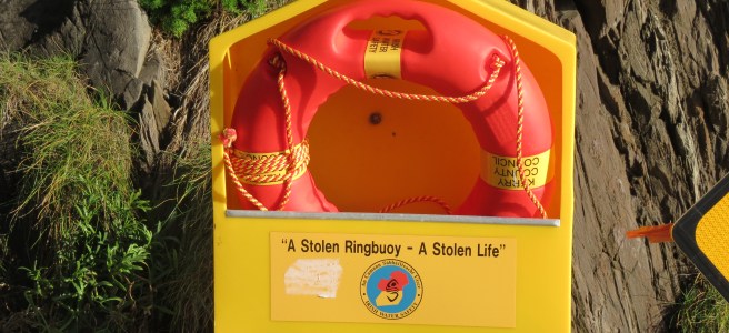 Can you imagine in this day of passwords, locks, and alarms to protect our most precious valuables, lifesavers (literally) like this one on the remote Ring of Kerry stay posted, unguarded? Talk about the “the honor system”! We saw a few of them on the western part of our recent trip in Ireland. They were not in plain sight, but around corners at the bottom of steep cobblestone and patch-work accesses of small beaches or old, hazardous boat launches. All the easier to snatch off the post and pop into one’s car if one was so inclined. Yet the well-chosen, philosophical and theological one-liner, “A Stolen Ringbuoy— a Stolen Life” appealed straight to one’s conscience. Would you dare remove the buoy for any other reason than, God-forbid, its intended purpose to save someone drowning in the nearby sea? Would you dare risk eternal consequences? I know I wouldn’t, but then I had a cynical thought. What if a person was so full of wickedness or didn’t believe in eternal consequences? What if they didn’t care about their fellow human being? Could they be so caviler to vandalize? Remove the ring and toss it into some ditch? Then I scanned the tawny, brush-topped cliffs sloping into the foaming surf, hemmed in by the mystical turquoise sea. Behind me were the endless rolling verdant hills dotted with sheep, rocks and old church foundations. How could one not feel closer to Heaven, or at least an unwavering, deep and reverent calm? An unquestioning obedience to that sign? Cliffs and sea on the Ring of Kerry