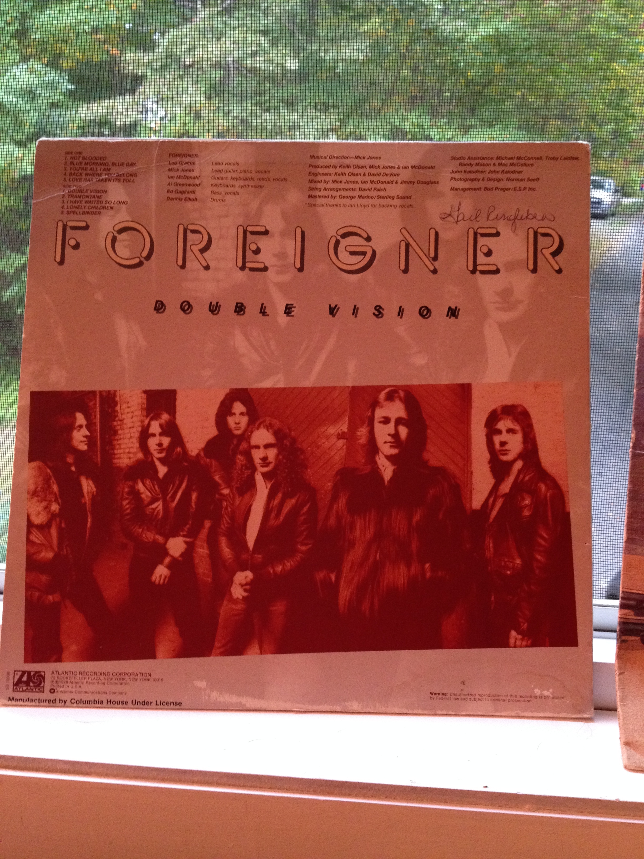 I dug half way through the REO Speedwagons, the Kiss, the Cars. I already had these. Three quarters, through, The Go-Gos, AC/DC, nothing yet. “I can feel it!” I said with mock conviction. “No way,” Bobbi said. Then, the third or so from the bottom was Foreigner, Double Vision. The guys were wearing short coats, not long ones, but it was Foreigner none-the-less, and I didn’t have this one. Three bucks, the guys said. Sold!